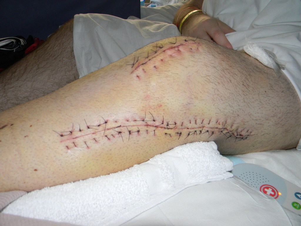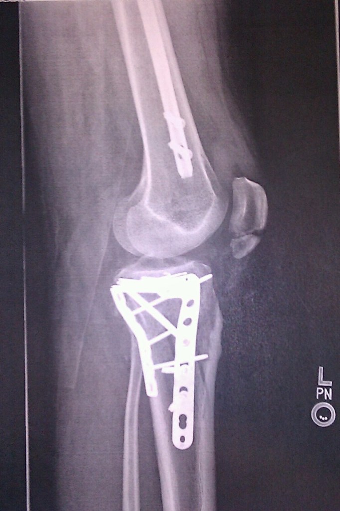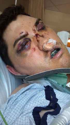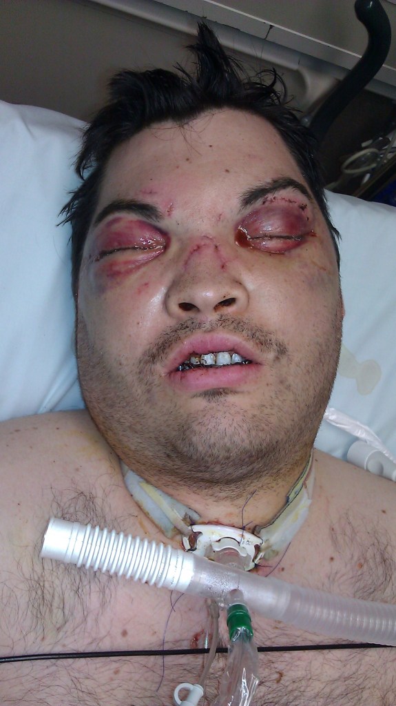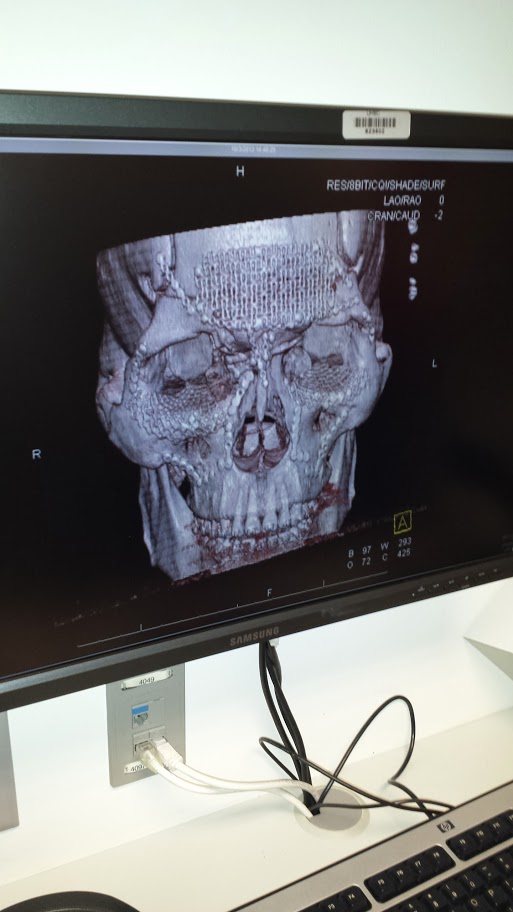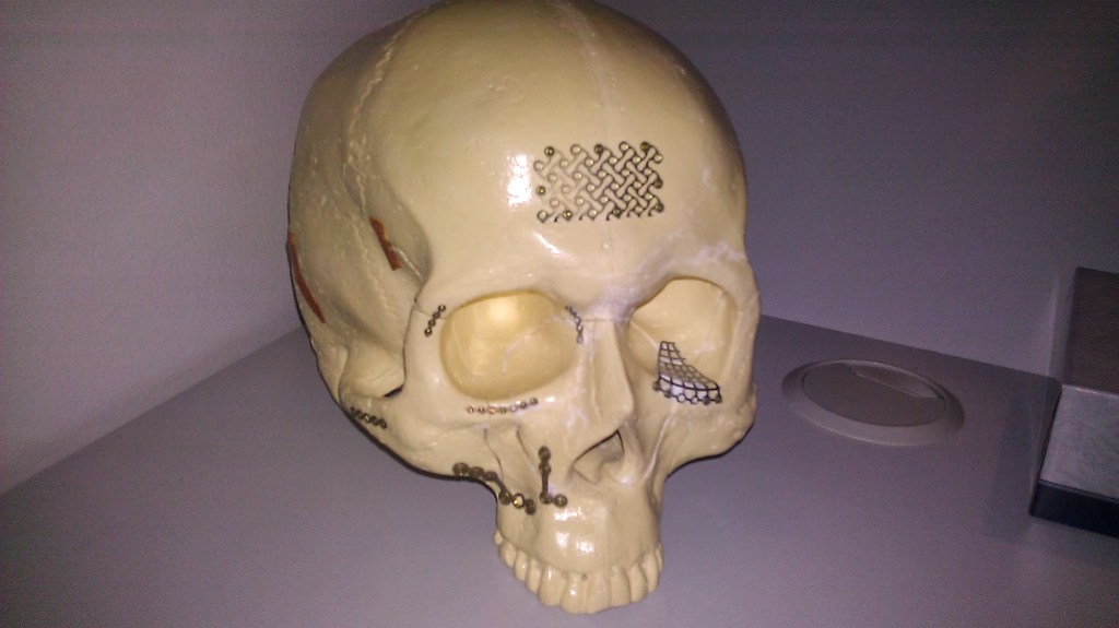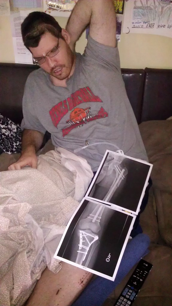 They placed a rod in his femur, put flexible sutures in his kneecap, and a scaffolding of hardware in his tibia. He wasn’t allowed to bear weight at all on that leg for months afterward and had to be in a wheelchair most of the time. They put extensive hardware all over in his face to piece it back together, including mesh across his forehead, in his eye sockets to hold up his eyes, plates to hold his eye sockets together, and various plates in his midface to hold things together. He still has some nerve damage to his eye (which has improved with time), as well as a pupil that doesn’t respond well to light.